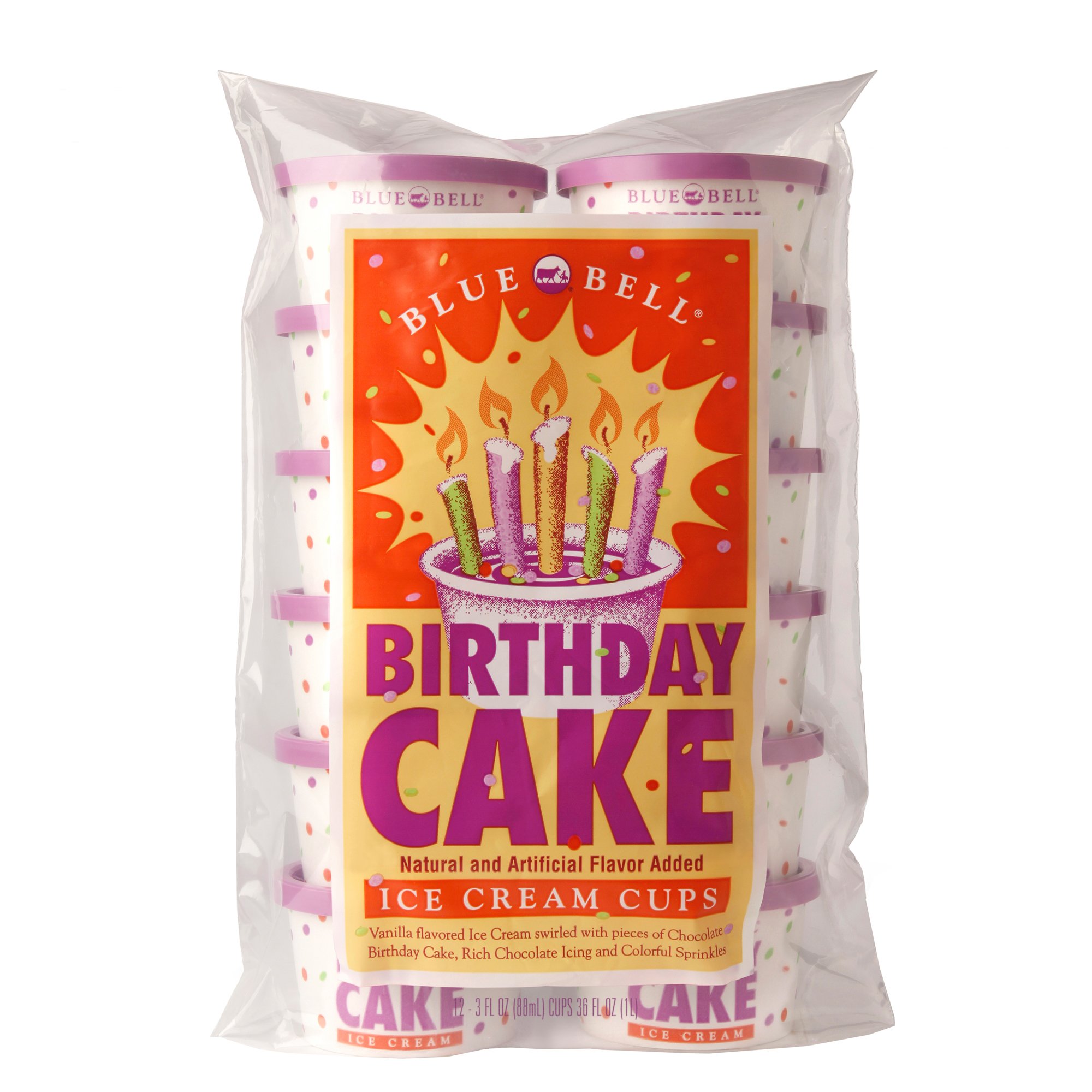 Blue Bell Ice Cream Cups Birthday Cake Natural and artificial flavor12 - 3 fl oz cups UPC Code 071899624318 Manufactured by Blue Bell Ice Cream Allergen Inside Helping. Pour ice cream mixture into a loaf pan. Pour into ice cream churn.
